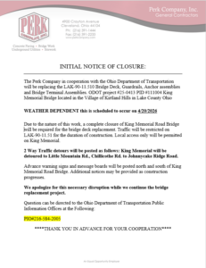 2 Way Traffic detours will be posted as follows: King Memorial will be detoured to Little Mountain Rd., Chillicothe Rd. to Johnnycake Ridge Road.